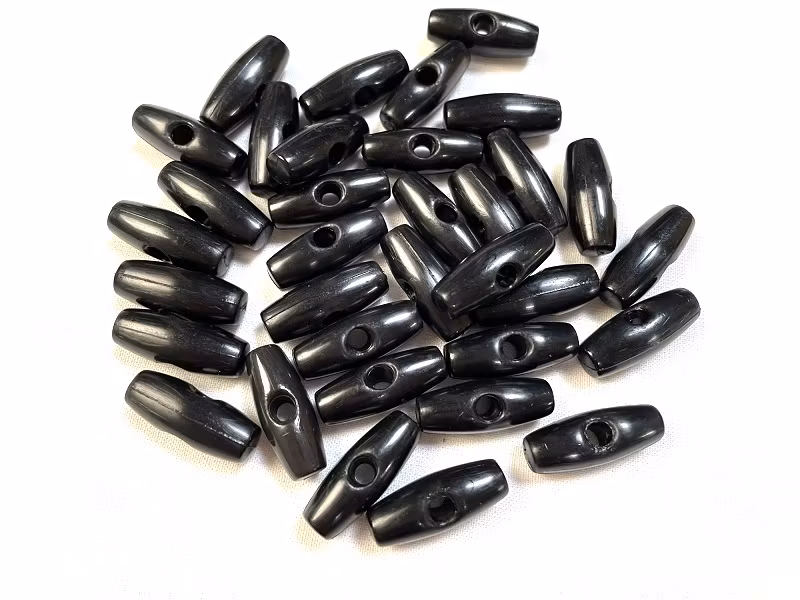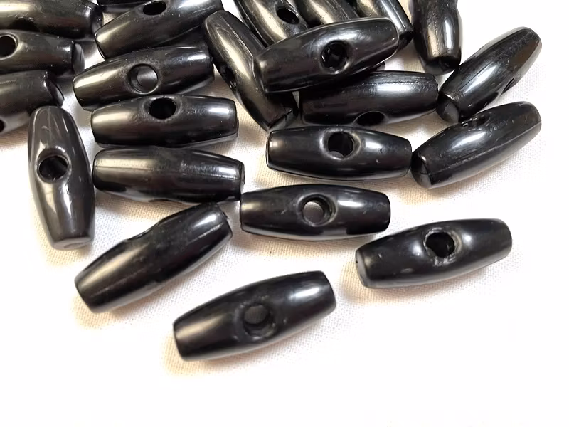 En duffelknapp i svart plast.