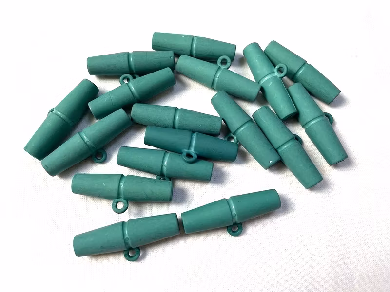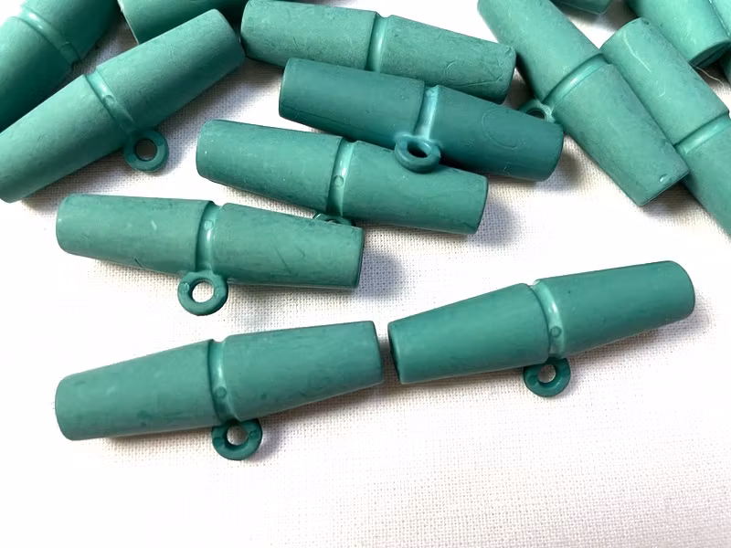 En duffelknapp i grön plast.