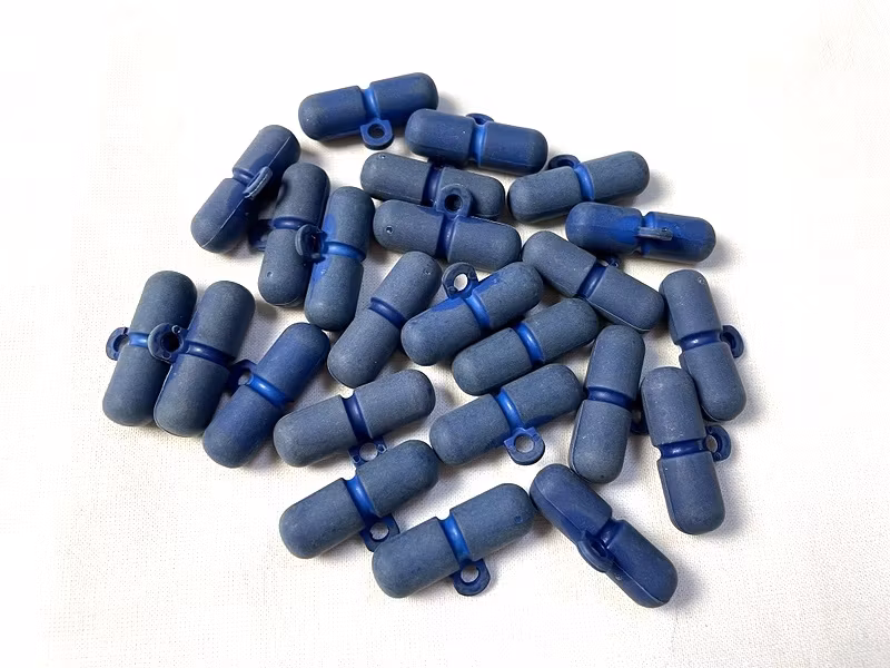 En duffelknapp i blå plast.