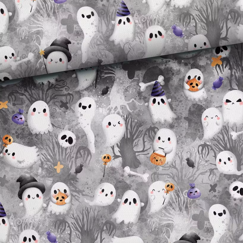 Ett mjukt, stretchigt joggingtyg med söta spöken på grå bakgrund.