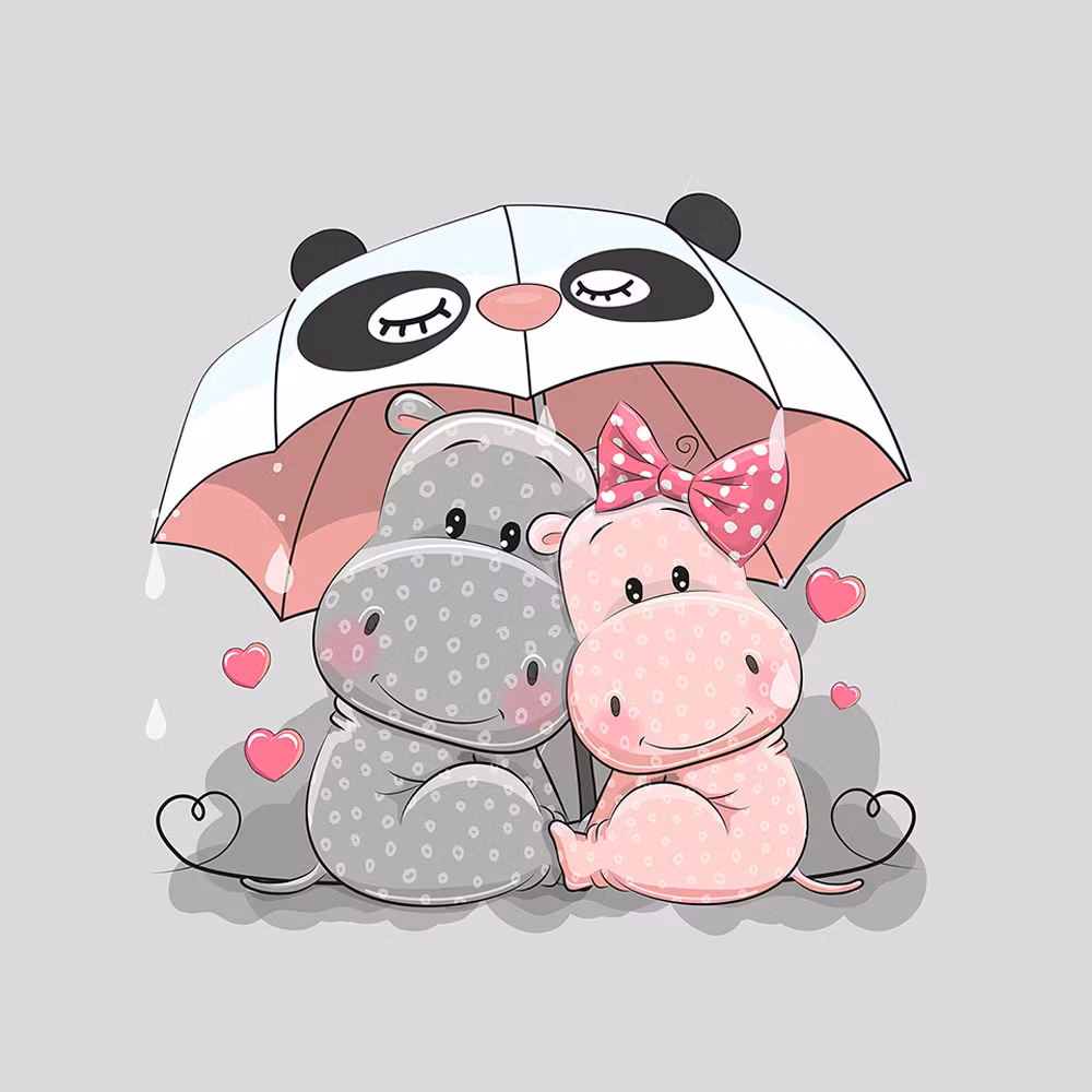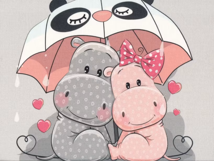 En 40 x 50 cm bit av mjukt, stretchigt joggingtyg med söta flodhästar på grå botten.