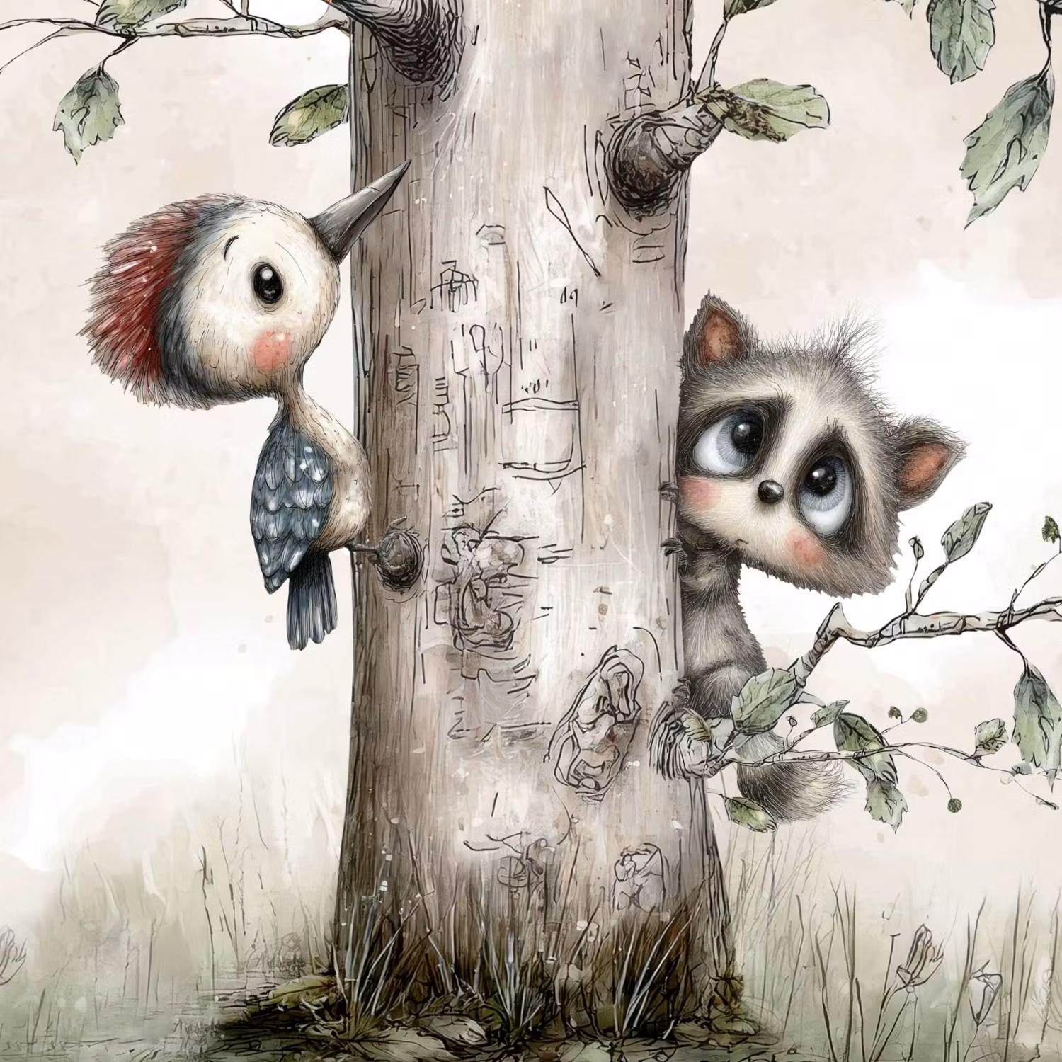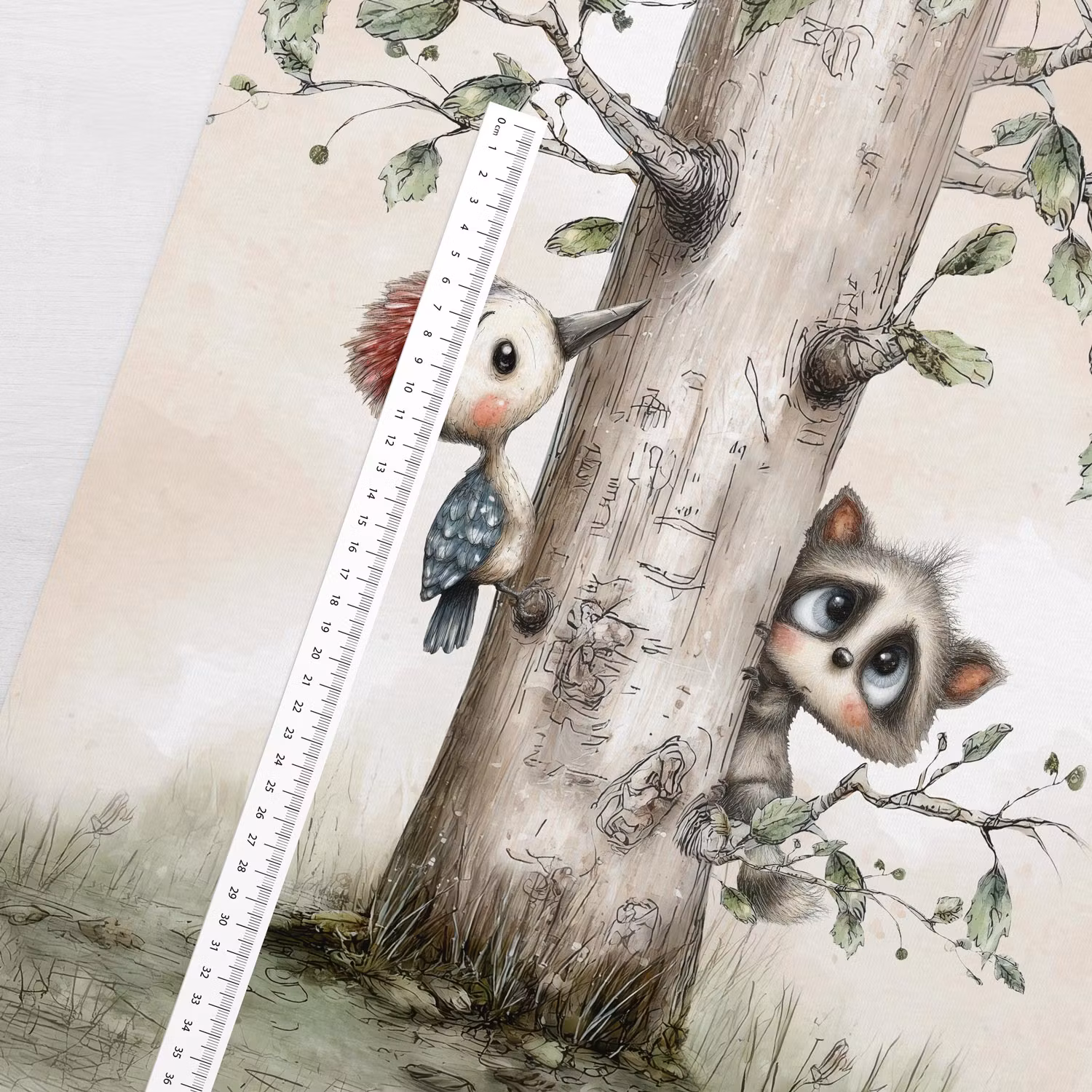 Möt Trädkompisar – en charmig panel i mjukt joggingtyg där nyfikna små vänner gömmer sig bakom trädstammen. Här kikar en busig tvättbjörn fram medan en liten fågel håller sällskap på andra sidan – en stillsam scen med mycket personlighet och värme.