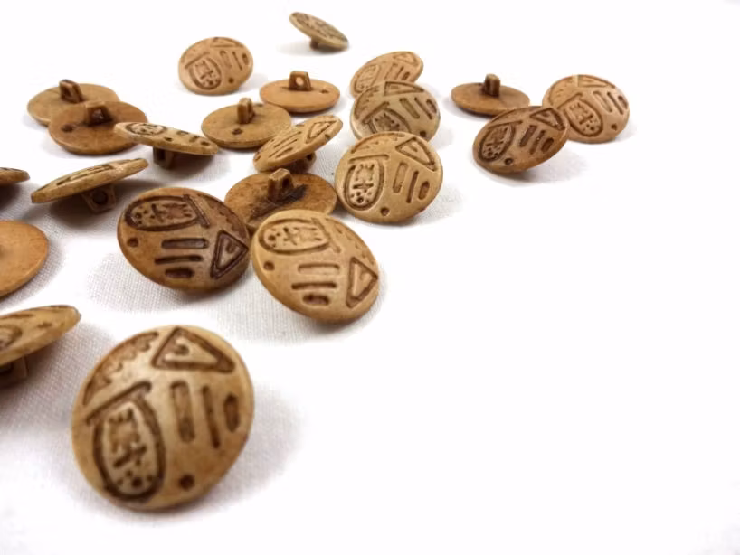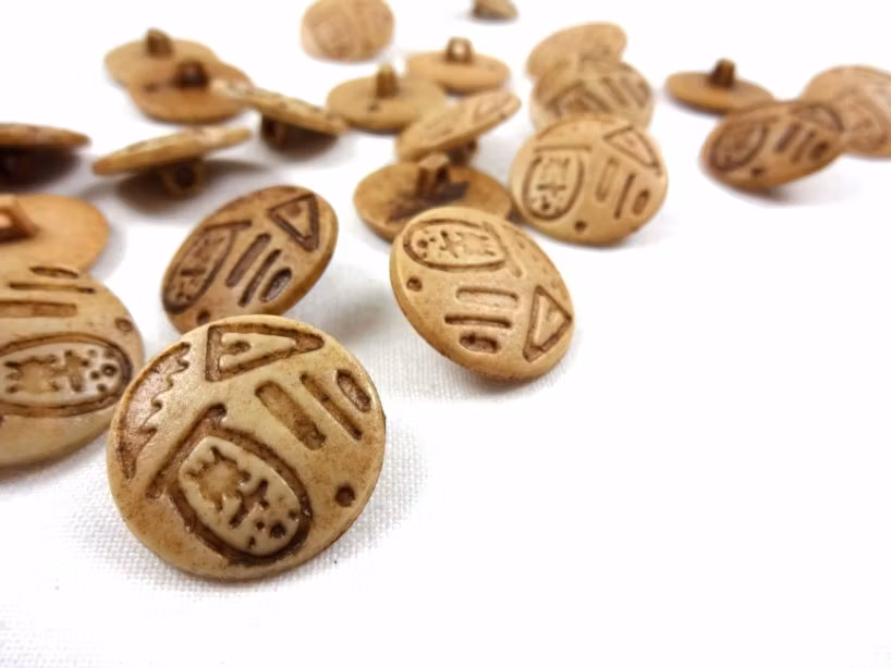 En rund plastknapp i beige med motiv av en fisk, triangel, löv och streck.