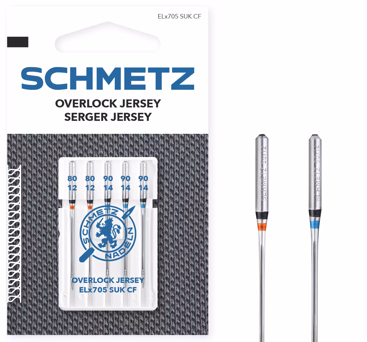 En förpackning med 5 stycken overlocknålar från Schmetz i storlek 80 och 90.