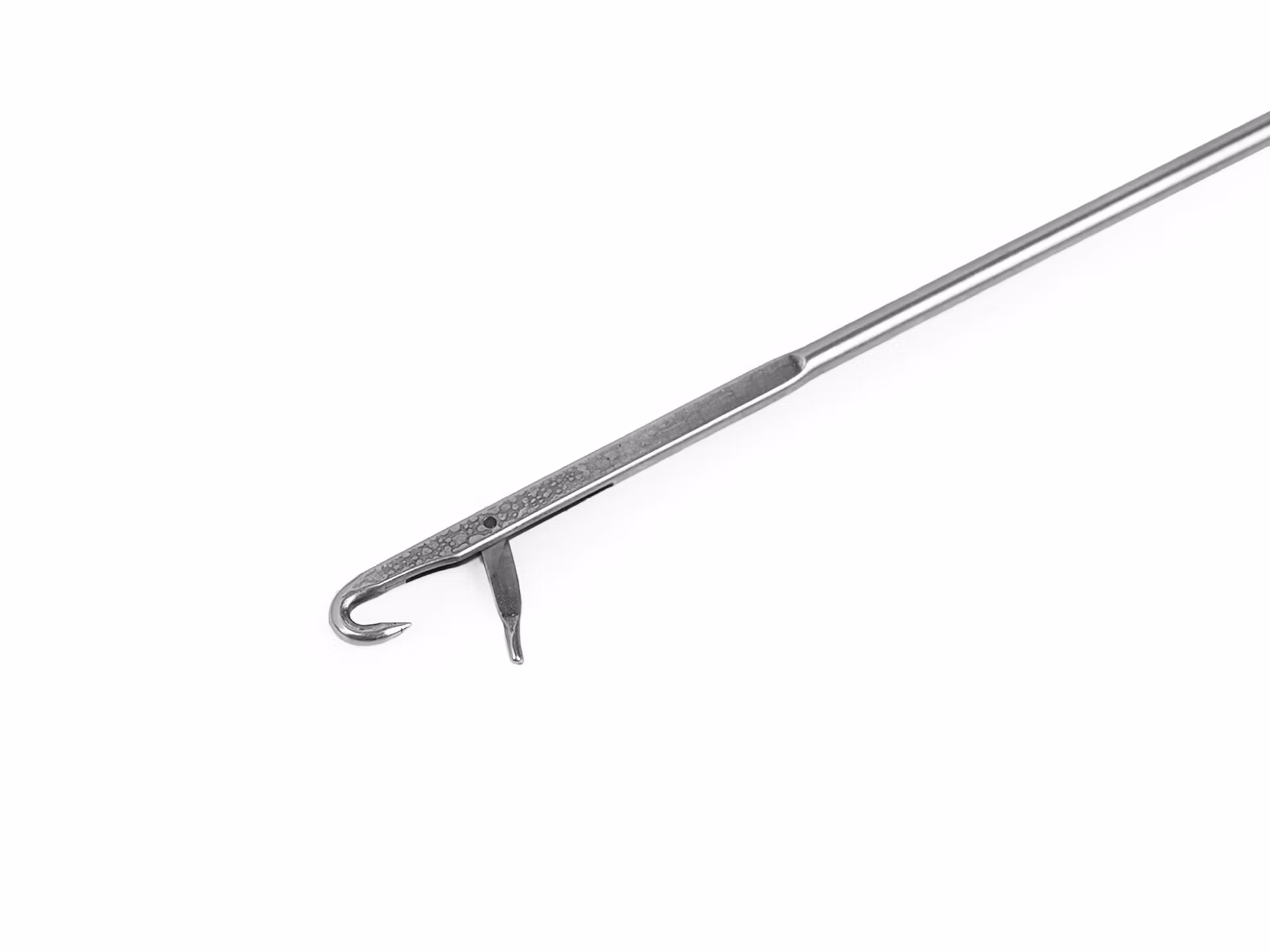 Metallträdaren fungerar likt en pincett där resåren fästs i ändarna och säkras med den lilla metallöglan. Trädningsnålen har krok i ena änden och ögla i den andra för smidig hantering och bättre kontroll när du arbetar.