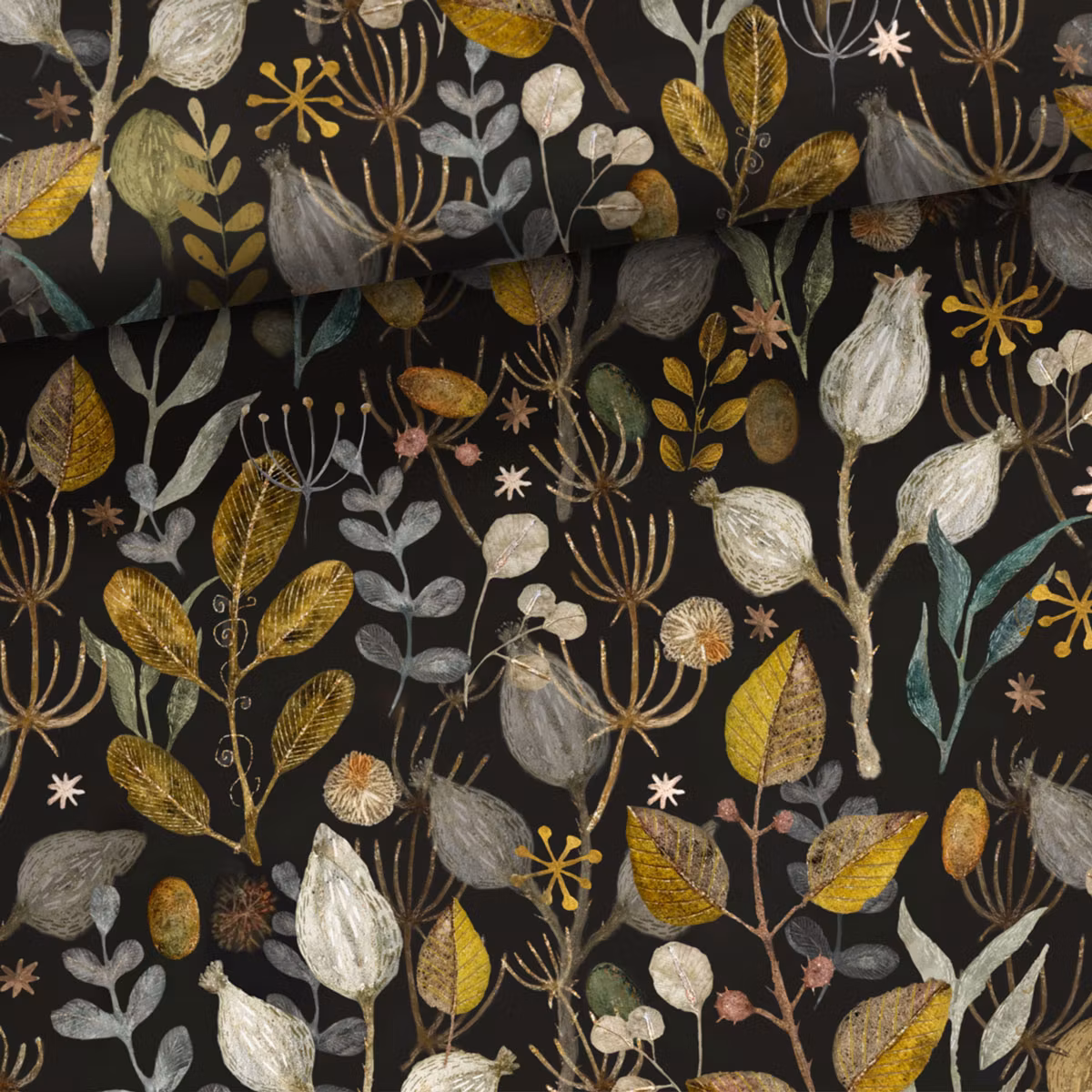 Denna trikå har digitalt tryck med massvis av gyllene blad på mörk bakgrund