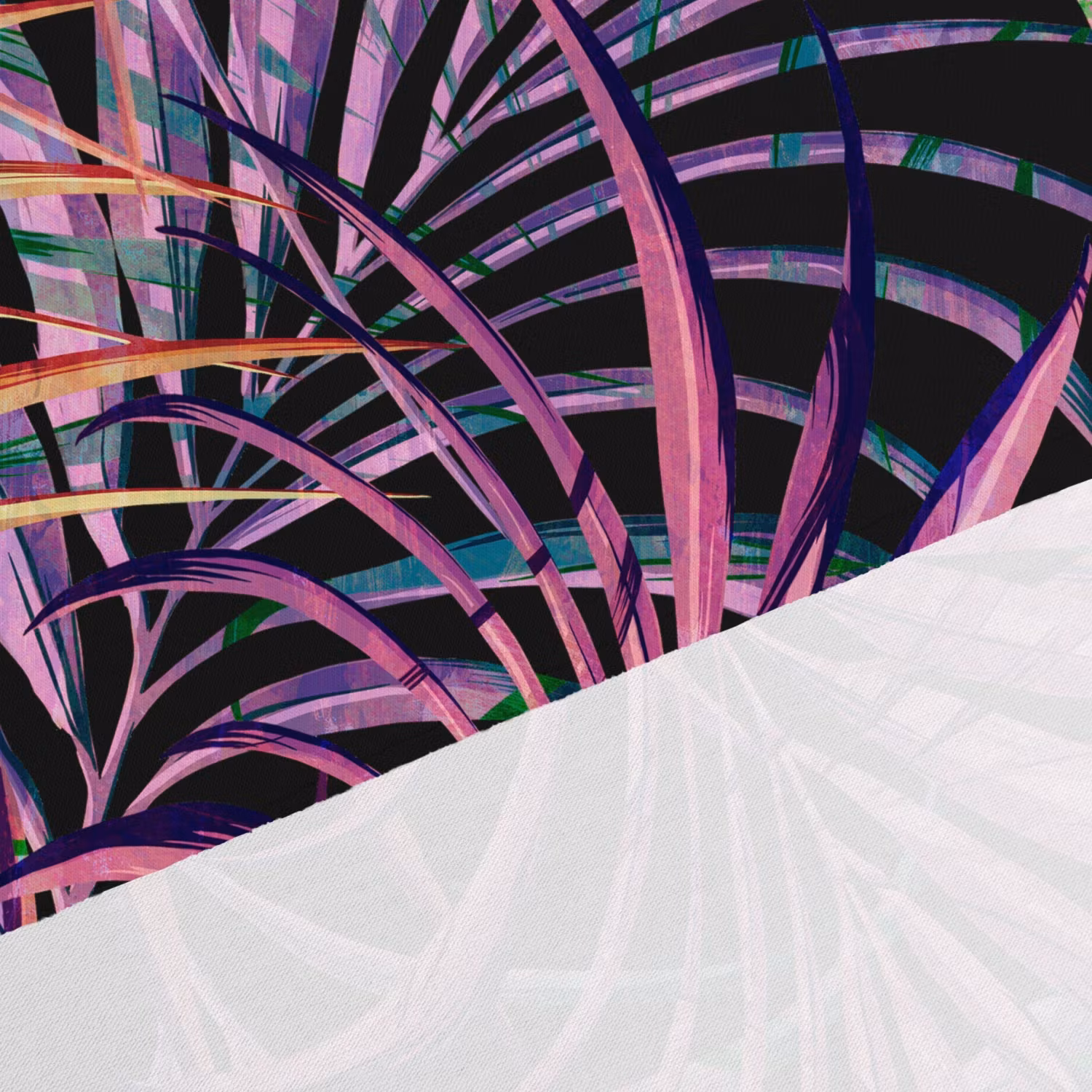 Ett modernt jerseytyg med tropiska palmblad i djupa färger mot en mörk bakgrund. Nattpalmer ger en spännande och stilren känsla med sina livfulla toner av rosa, lila och grönt – perfekt för dig som vill sy plagg med lite mer attityd och karaktär.