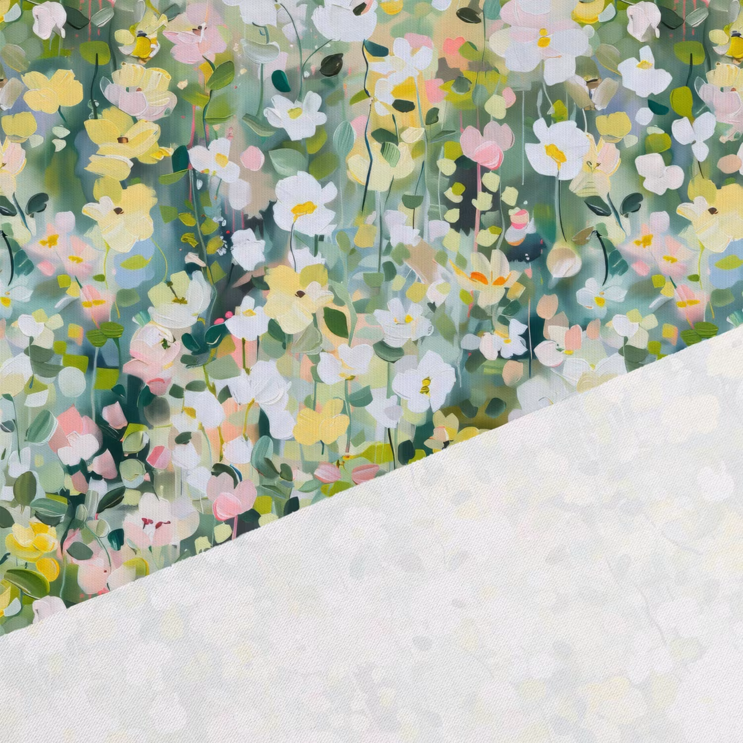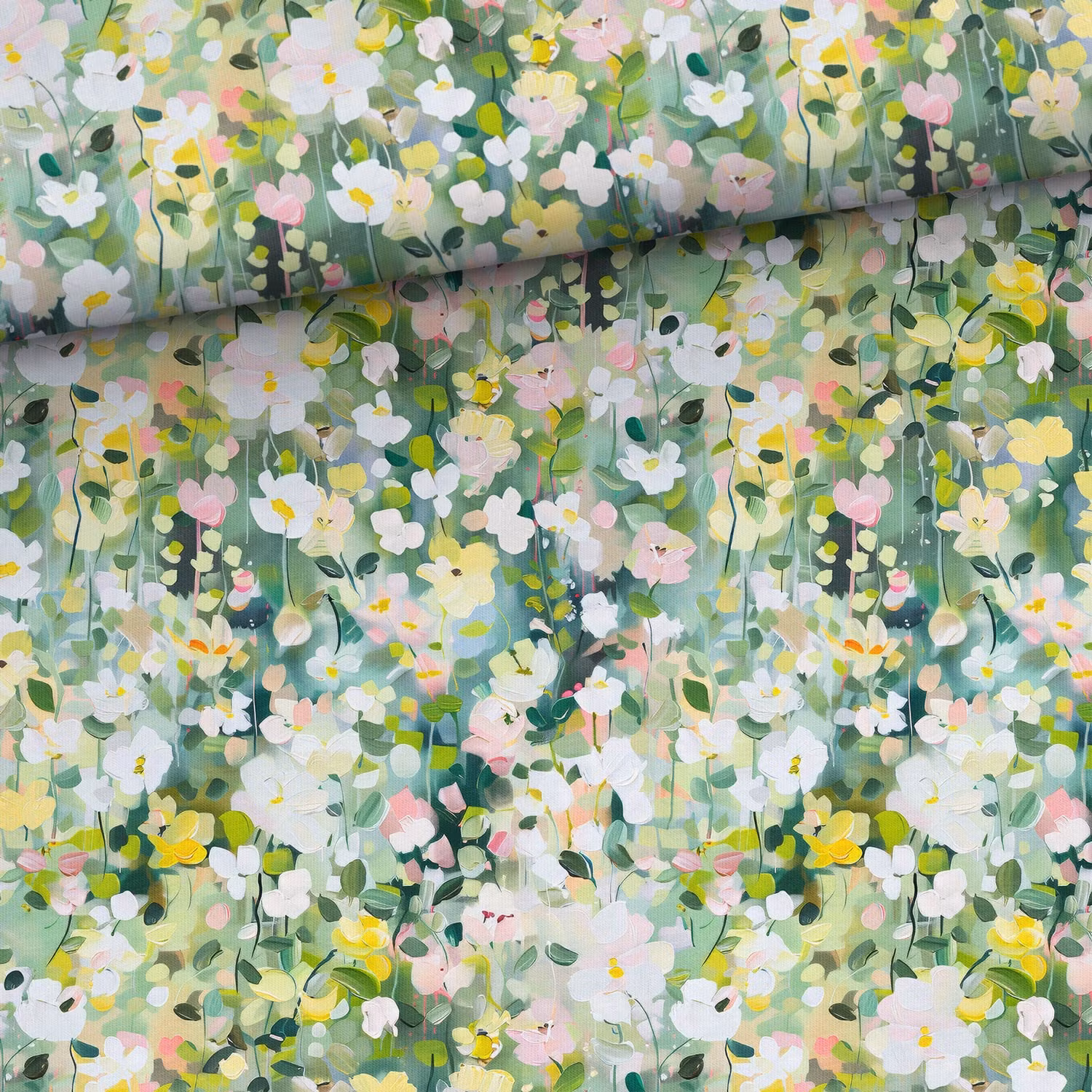 Ett mjukt och harmoniskt jerseytyg med små blomster som för tankarna till en ljus våräng. Våräng har ett lugnt och naturligt uttryck där gröna toner möter ljusa pastellblommor – perfekt för dig som gillar mjuka, naturnära mönster.