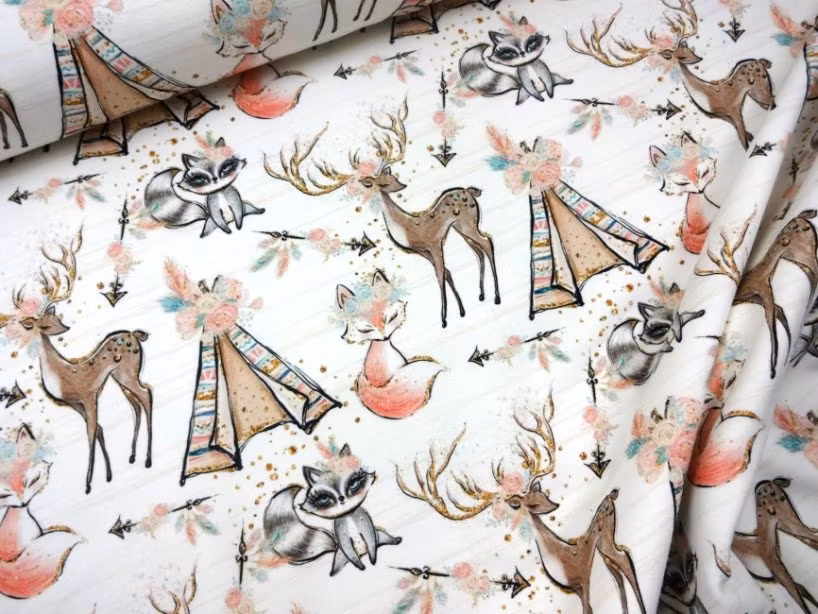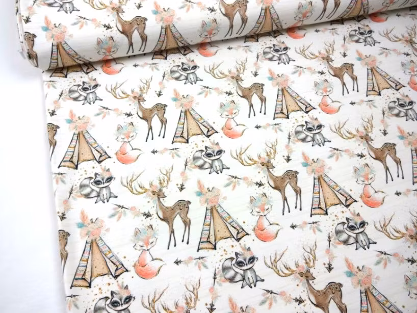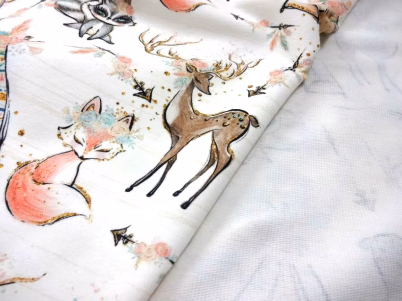 Ett mjukt och stretchigt joggingtyg med vildmarksdjur på vit botten.