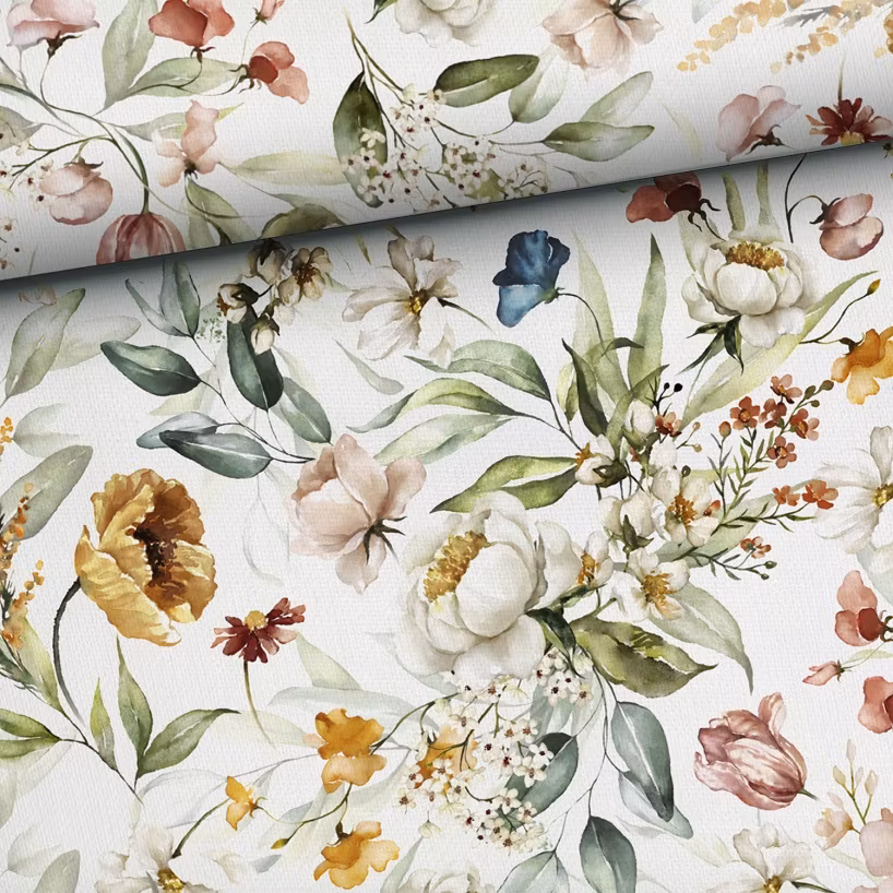 Ett mjukt, stretchigt joggingtyg med digitalt tryck av vackra blommor på vit botten.