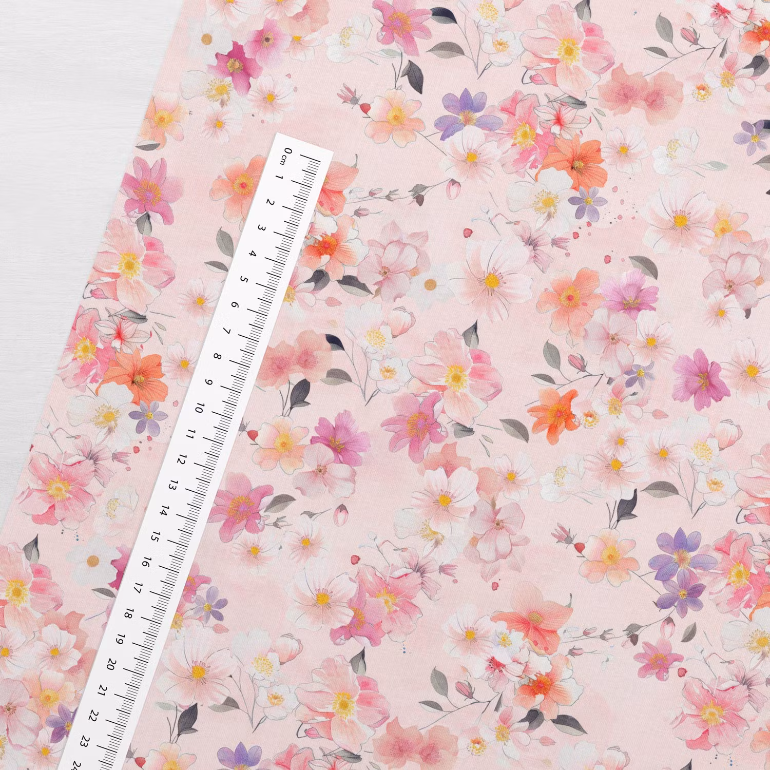 Ett ljuvligt joggintyger med små, akvarellinspirerade blommor i rosa, aprikos, lila och vitt mot en mjuk rosa botten. Småblommor rosa har ett lätt, luftigt uttryck som passar perfekt till både barn- och vuxenplagg.