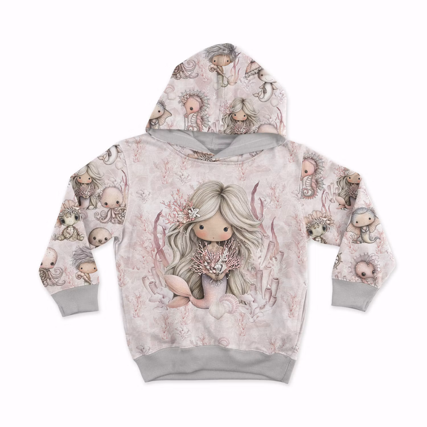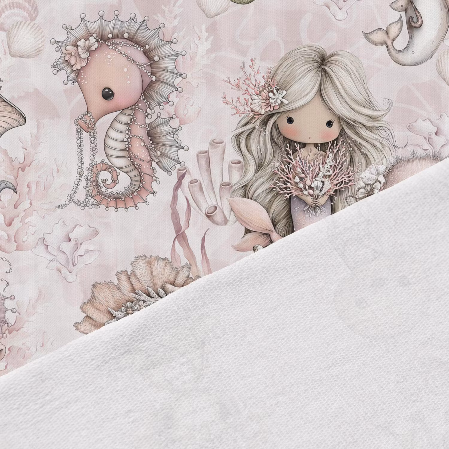 Dröm dig bort till en mjuk undervattensvärld med Sjöjungfrudröm – ett ljuvligt joggingtyg fyllt av små sjöjungfrur, havsvarelser och skira koraller i harmoniska toner av puderrosa, beige och milda pasteller.