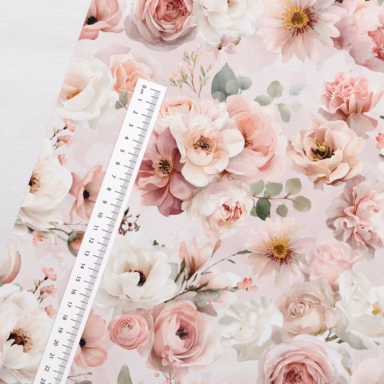 Dröm dig bort till en blommande trädgård med Rosenträdgård – ett elegant joggingtyg fyllt av rosor och blomster i mjuka, pudriga nyanser. Det harmoniska mönstret går i toner av rosa, crème och dämpat grönt, vilket ger ett lugnt och tidlöst uttryck.
