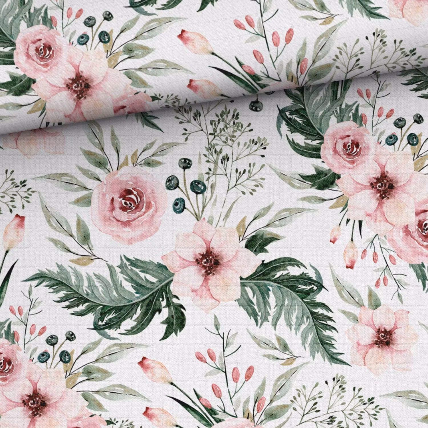 Bambumuslin som är ett luftigt, mjukt och tunt tyg med ett vackert tetranätmönster. Denna bambumuslin har ett mönster med blommor.